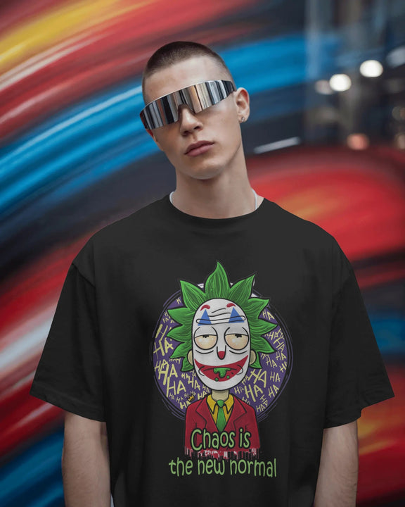 Featuring a stylized mashup of two iconic characters known for their brilliant chaos, this tee celebrates the beautifully unhinged nature of modern life. The phrase, "Chaos is the new normal," is a declaration that you've found your center in the middle of the madness.